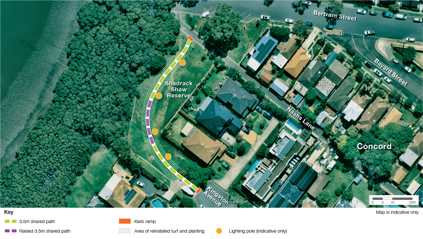 Council is building a new 3.5m wide shared path through Shadrack Shaw Reserve in Concord connecting Kingston Avenue and Nashs Lane/Bertram Street. New kerb ramps will be constructed on Kingston Avenue and Nashs Lane/Bertram Street.